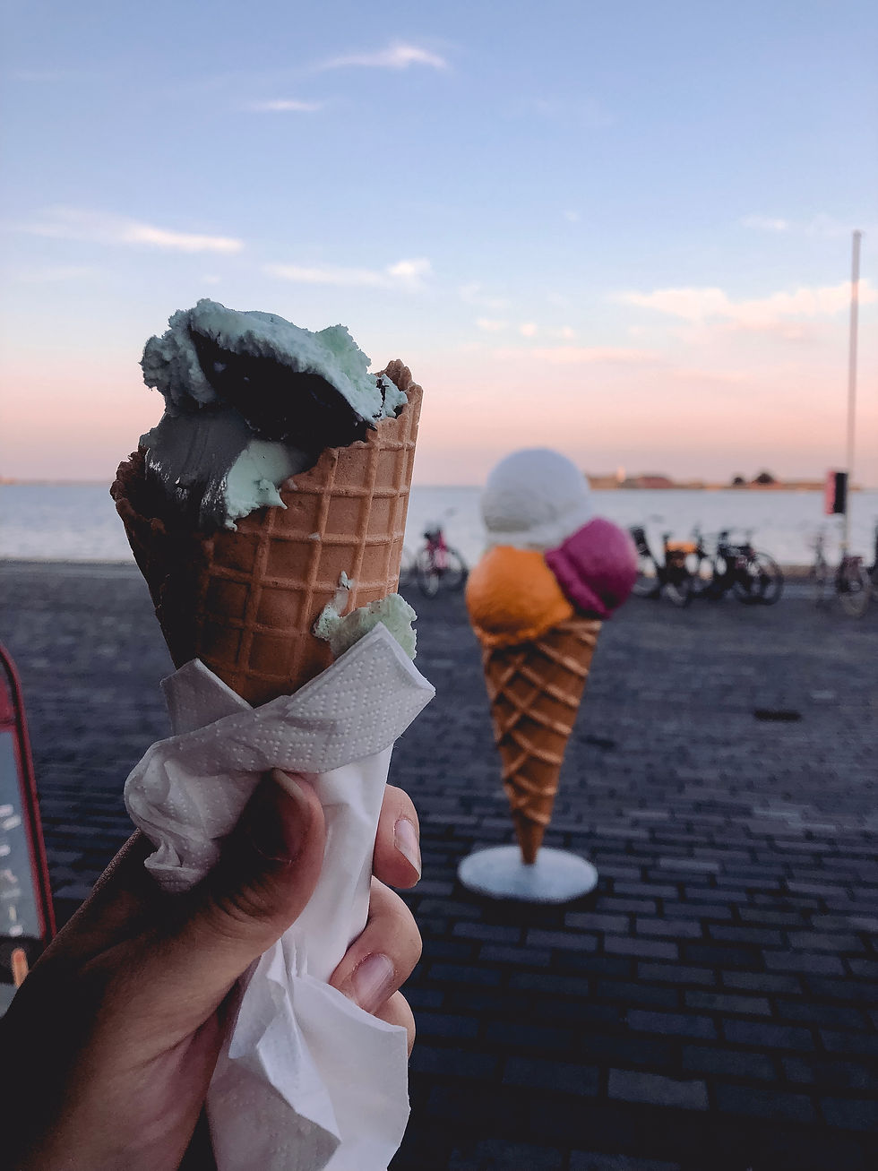 After getting ready for the day I headed out to the neighborhood of Brøndbyøster to find the giant Sleeping Louis, this would be my 5th giant. To get to the neighborhood I took the S-train, this way I could take my bike. Once I got off at the station in Brøndbyøster I rode to the nearby campsite where the giant was said to be. This one ended up not being as hidden as the others, so I found him pretty quickly. He gets his name from the way that he is laying on the ground. After finding him I rode back to the local station to ride the train back to Copenhagen Central Station. When I got back downtown, I rode to my apartment to grab some supplies before riding to the beach where I was meeting Raechel, Meredith, and Delaney for dinner. They met me at the metro station, and we went to the grocery store together to pick out the food we wanted. Before finding a spot to lay out our picnic we got some ice cream from the shop nearby. At this ice cream shop, I had some of the best banana ice cream. It tasted like banana laffy taffy with chocolate chips in it. After getting our ice cream we walked to the beach and found a good place to spread out our blankets and prepare the food that we got. We snacked and chatted for almost two hours before heading back home.